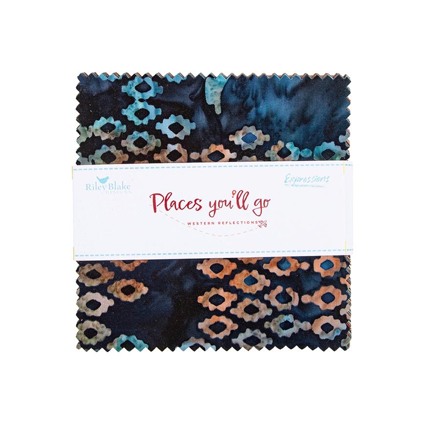 This 5" Stacker precut bundle includes 42 pieces from the Places You'll Go Western Reflections collection for Riley Blake Designs. Each print will be included 2-3 times in the bundle