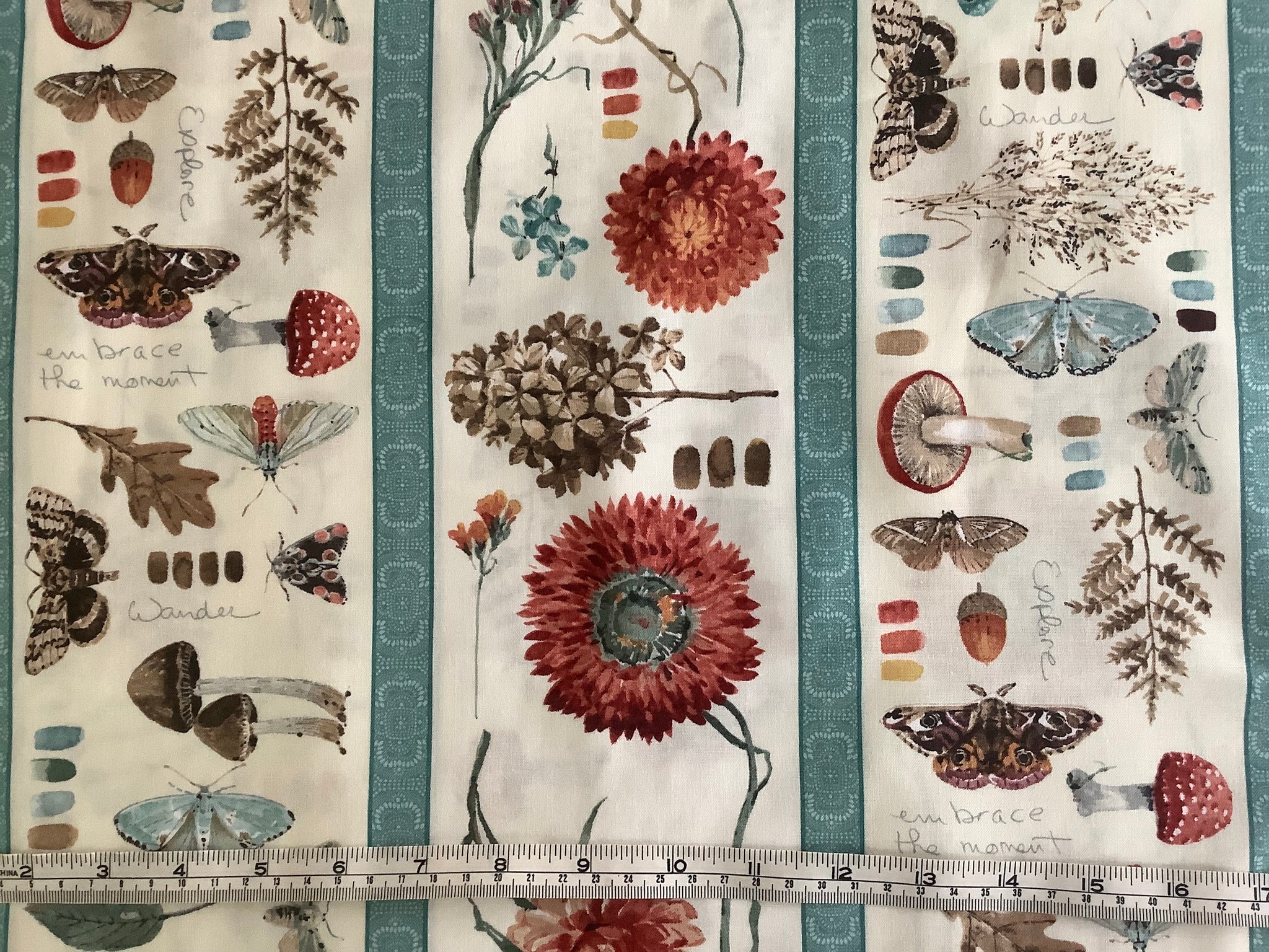 This charming fabric features a multi-repeating stripe design with a delightful array of botanical and insect illustrations, perfect for adding a touch of nature-inspired elegance to any project.