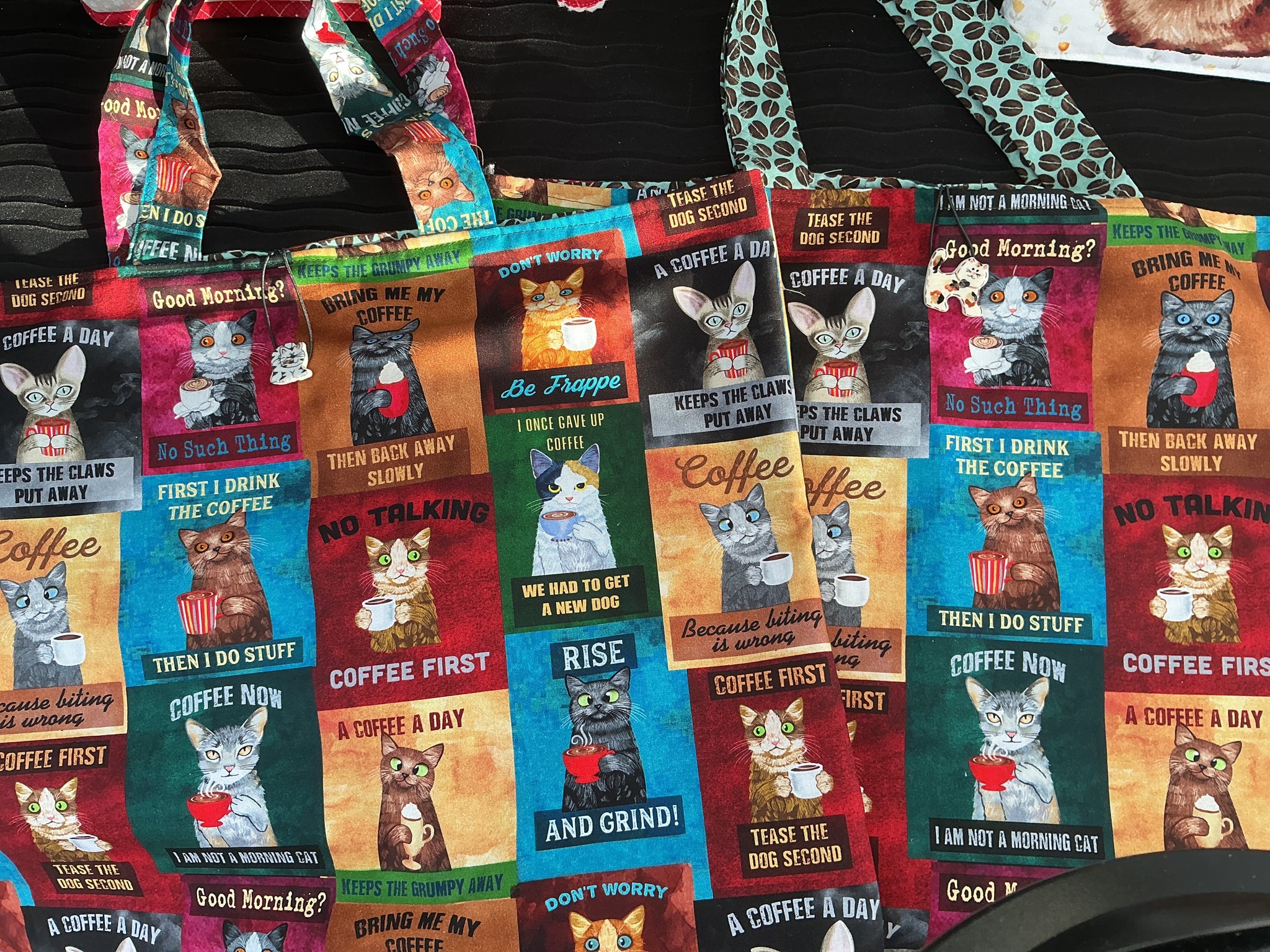 Market/shopper totes. All except ruffled and Vintage Play have gussetted bottoms. Tote measurements below & in images. Shell fabric is lightweight canvas resembling twill. Interior fabric quilt cotton blue shells.
