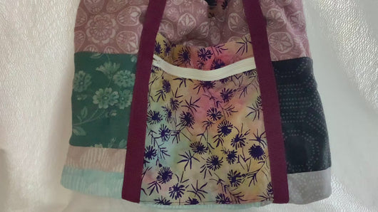 Jacquard pieced zipped pocket tote about 19 inch wide by 14 inch high.