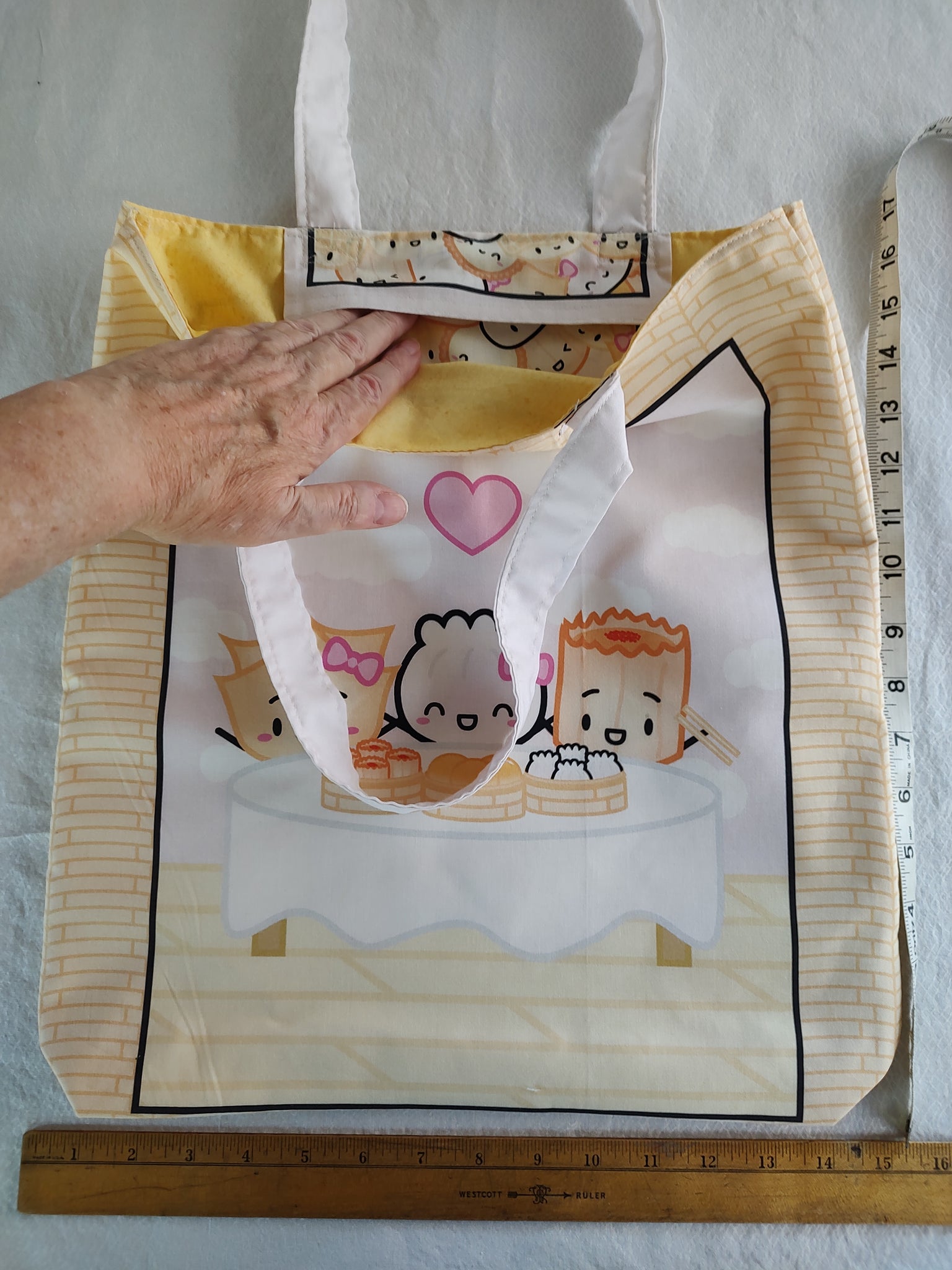 Market/shopper totes. All except ruffled and Vintage Play have gussetted bottoms. Tote measurements below & in images. Shell fabric is lightweight canvas resembling twill. Interior fabric quilt cotton blue shells.