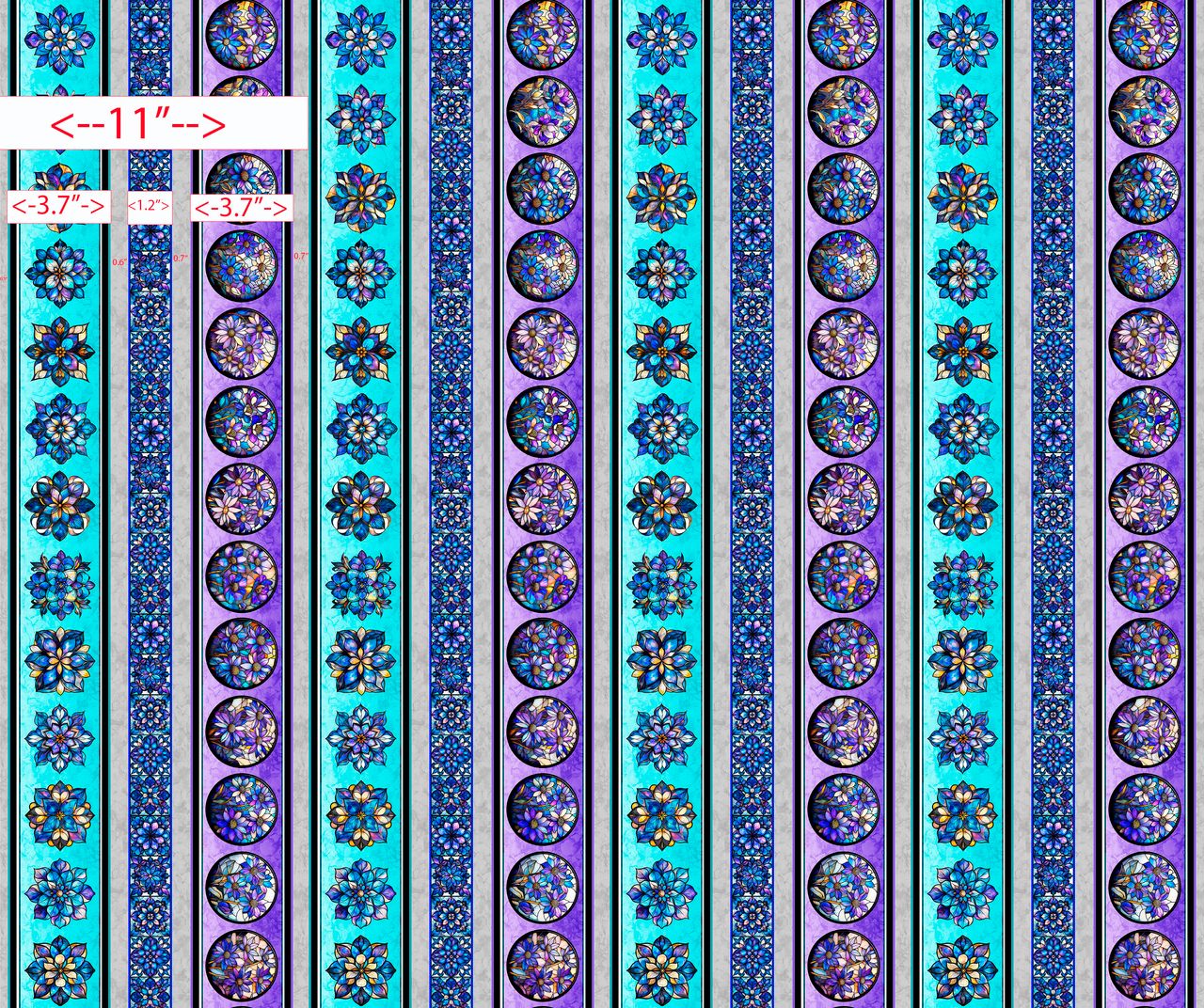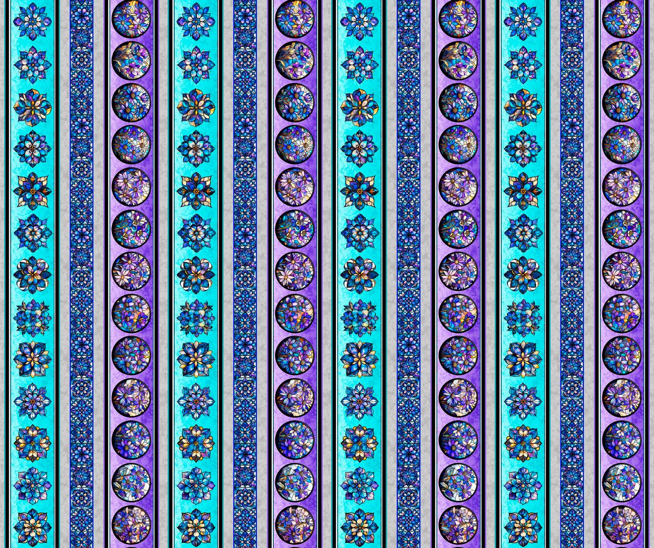 A stunning 36" fabric panel is reminiscent of the intricate beauty of stained glass, featuring a rich color palette of deep blues, vibrant violets, turquoise, and regal purples. This is the border stripe from the collection. Bring a sense of elegance and artistry to any project with a wide range of design layouts that offer endless creative possibilities. ©Morris Creative Group