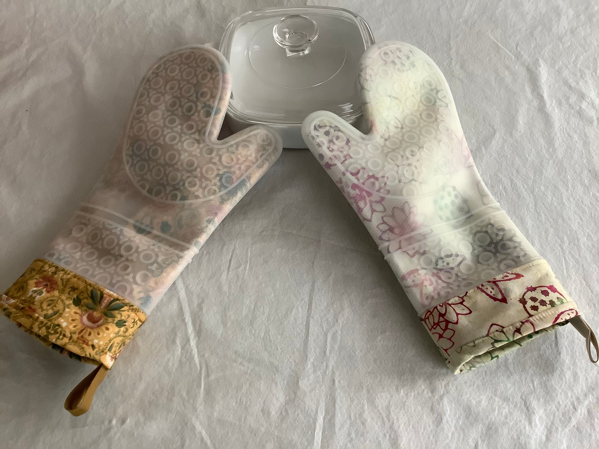 Designer silicone oven mitt with your favorite fabrics. Transparent silicone overlay for heat resistance up to 450 degrees. Choose red, green, or transparent. Custom can be available in 3 weeks.