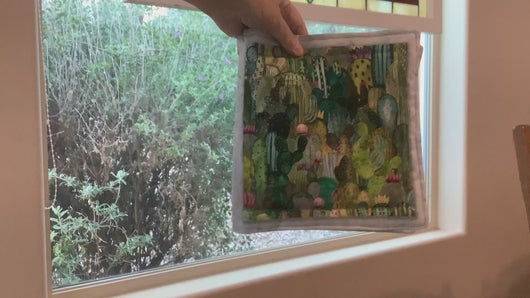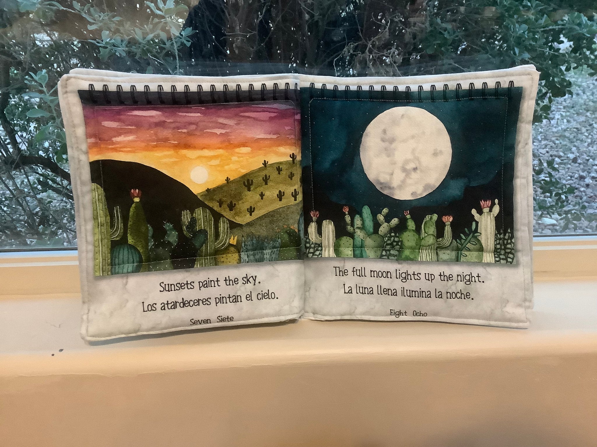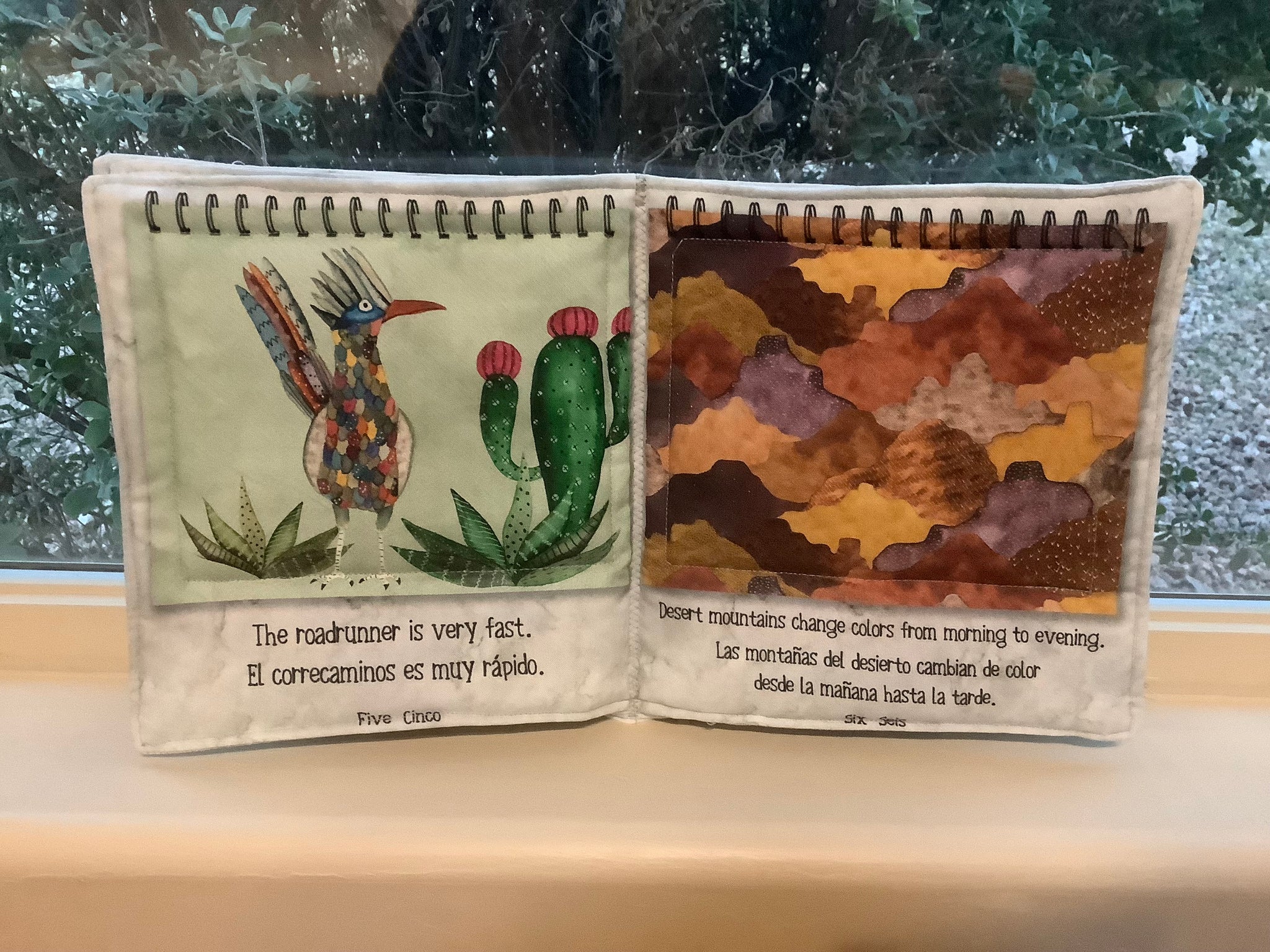 This fabric soft book sewn by Pat features a delightful series of illustrated panels, each depicting a unique desert scene with vibrant cacti, serene landscapes, and charming wildlife. The design includes detailed images of various cacti, an owl, a rabbit, and a roadrunner, all set against a backdrop of colorful sunsets, starry nights, and mountainous horizons. Each panel is bordered with a soft, striped pattern, adding a touch of warmth to the overall aesthetic. Celebrates the beauty of the desert.