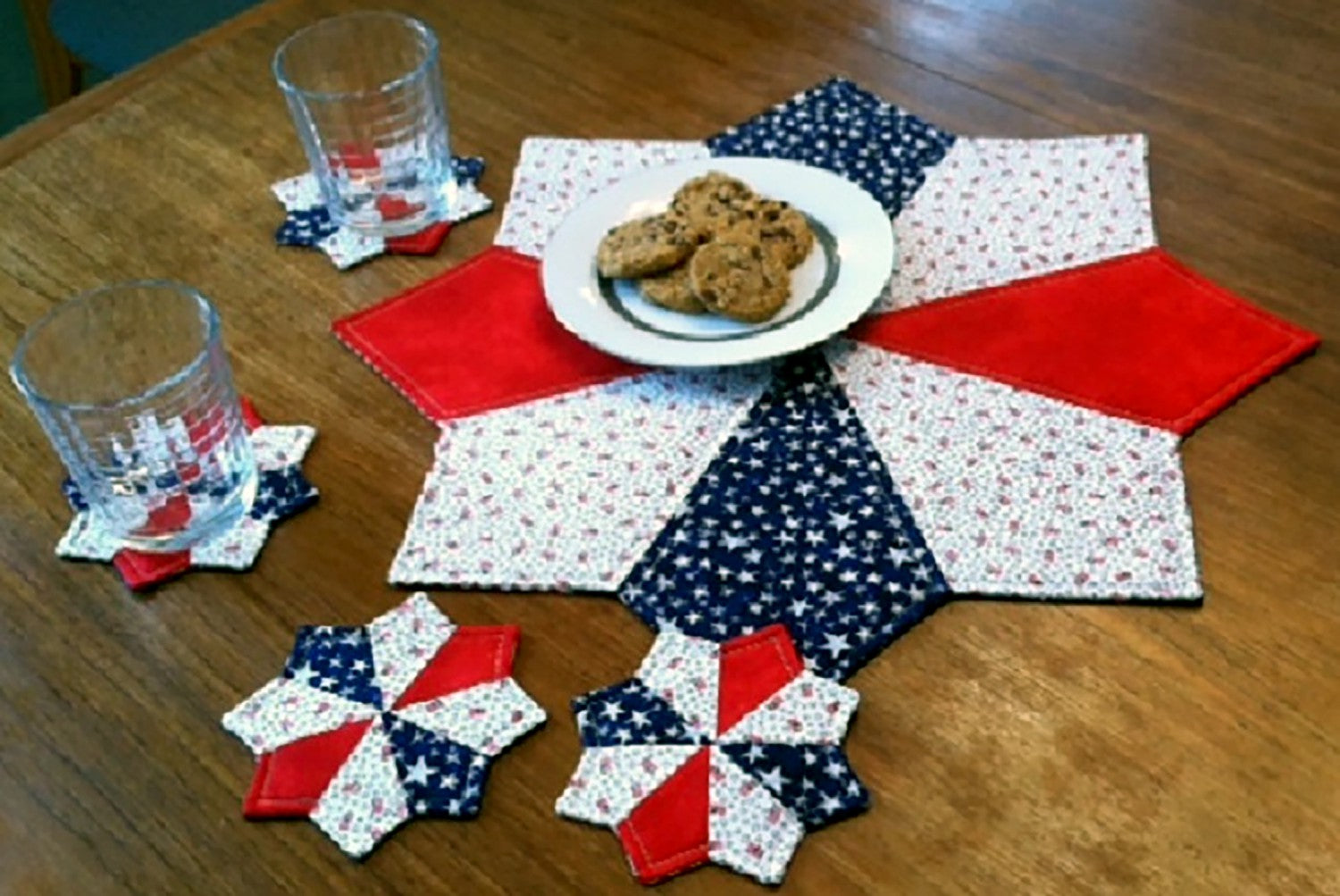 Two or three fat quarters plus a backing fabric make this set of four 5-inch coasters and a 20-inch table topper. Make it with an insulating fabric (available separately) and it can perform double duty as a trivet for those 4th of July and other holiday potlucks. While you’re at it, why not make some in other seasonal fabrics? The kaleidoscope blocks are cut with the Creative Grids Spiderweb Ruler CGRKA6 (available separately)