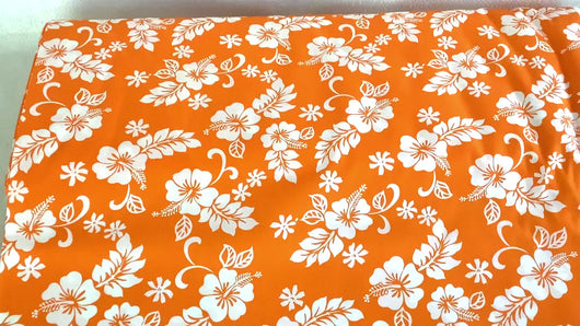 Lovely tropical from TransPacific. Hibiscus cotton. White on bright orange.