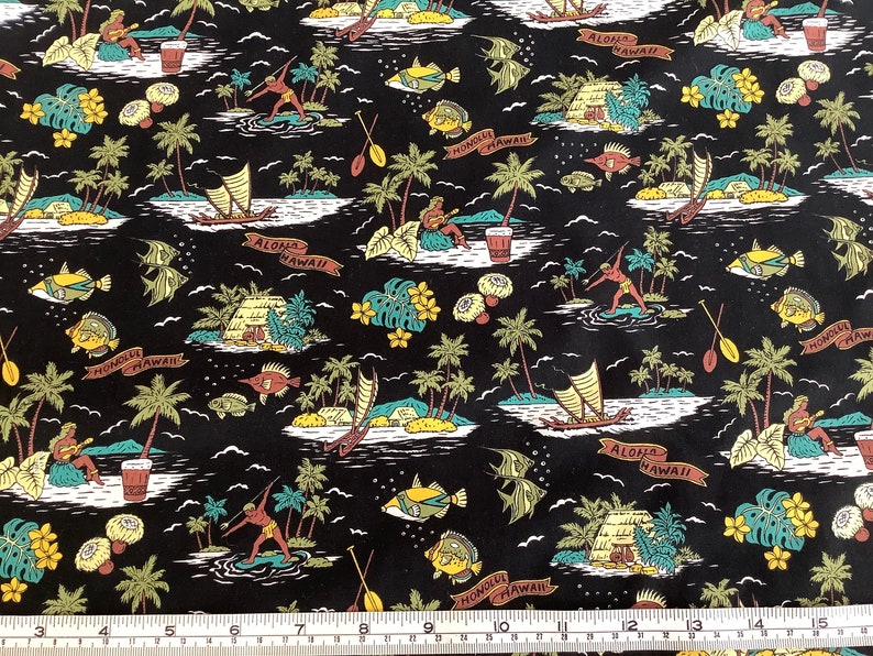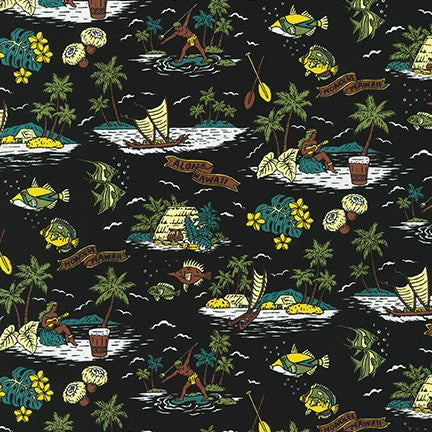 Hawaiian style ukulele, leis, fish, canoes, and iconic images from Robert Kaufman. Black colorway
